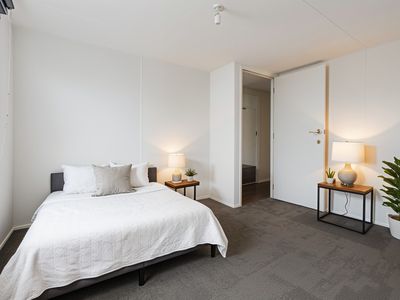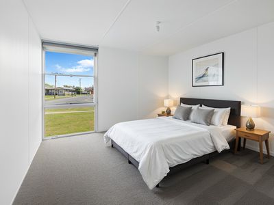 The fully renovated and stunning bathroom continues the modern theme, complete with a bath, shower, and vanity, while a stunning merbau barn door adds a unique and tasteful design feature.