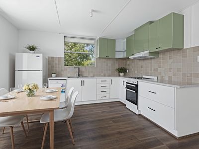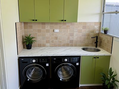 The laundry has also been updated to tie in with the kitchen following the modern green cabinets and spanish tiles.