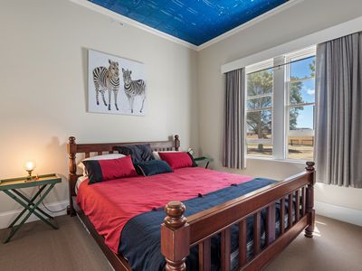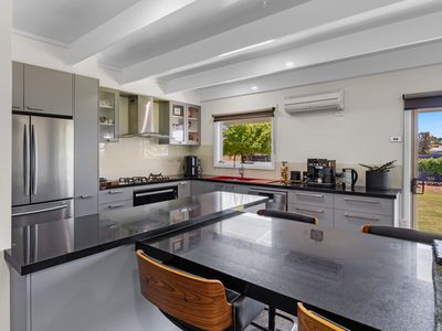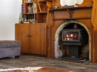 The large living room is surrounded by colonial style windows and French doors that open to the side enclosed yard. There is ample room for another dining space if needed; otherwise, enjoy the space on offer, all kept warm in winter with the a wood heater.