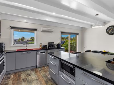 At the heart of the home and part of the original property, is the well-appointed and updated kitchen with classy grey granite benchtops, island bench and a built-in dining table, while still allowing for room for an additional casual dining space. Sliding glass doors open to the immaculate and low-maintenance side yard. Across the hall opens up into a spacious lounge with an original mantel and chimney. A perfect room to unwind by the fireplace and enjoy your favourite book or use as a rumpus room for the kids.
