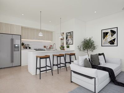 * Kitchen with pendant lights, 20mm stone benchtops, and soft-close cabinetry