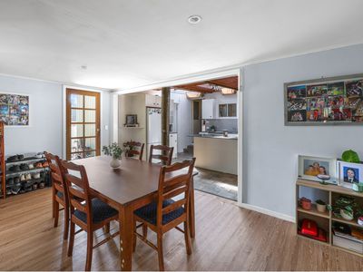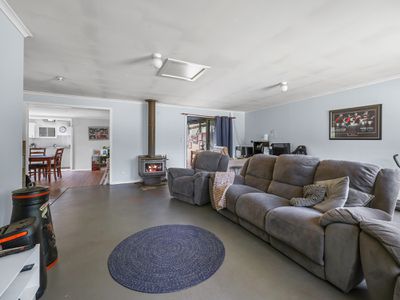 Inside, you’ll find a massive formal lounge featuring painted concrete floors and a combustion heater. This flows through to the formal dining room and into the updated kitchen, complete with a large island bench, Belina oven, exposed beams, slate flooring, and even a beautifully stained and polished tree trunk feature. A small casual dining area compliments the space.