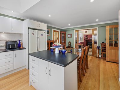 The ground floor forms the heart of the home and hosts a stunning verandah wrapping around the front of the home. Entering the lead light glass front door, the home embraces you immediately with the expansive hallway which leads to a welcoming kitchen/dining area and a comfortable lounge complete with plush carpet and a gas log fire. Beautiful Tasmanian Oak flooring flows through the main living spaces and the kitchen includes quality 900mm appliances, ample bench space and modern finishes plus a near new reverse cycle keeps the temperature under control.